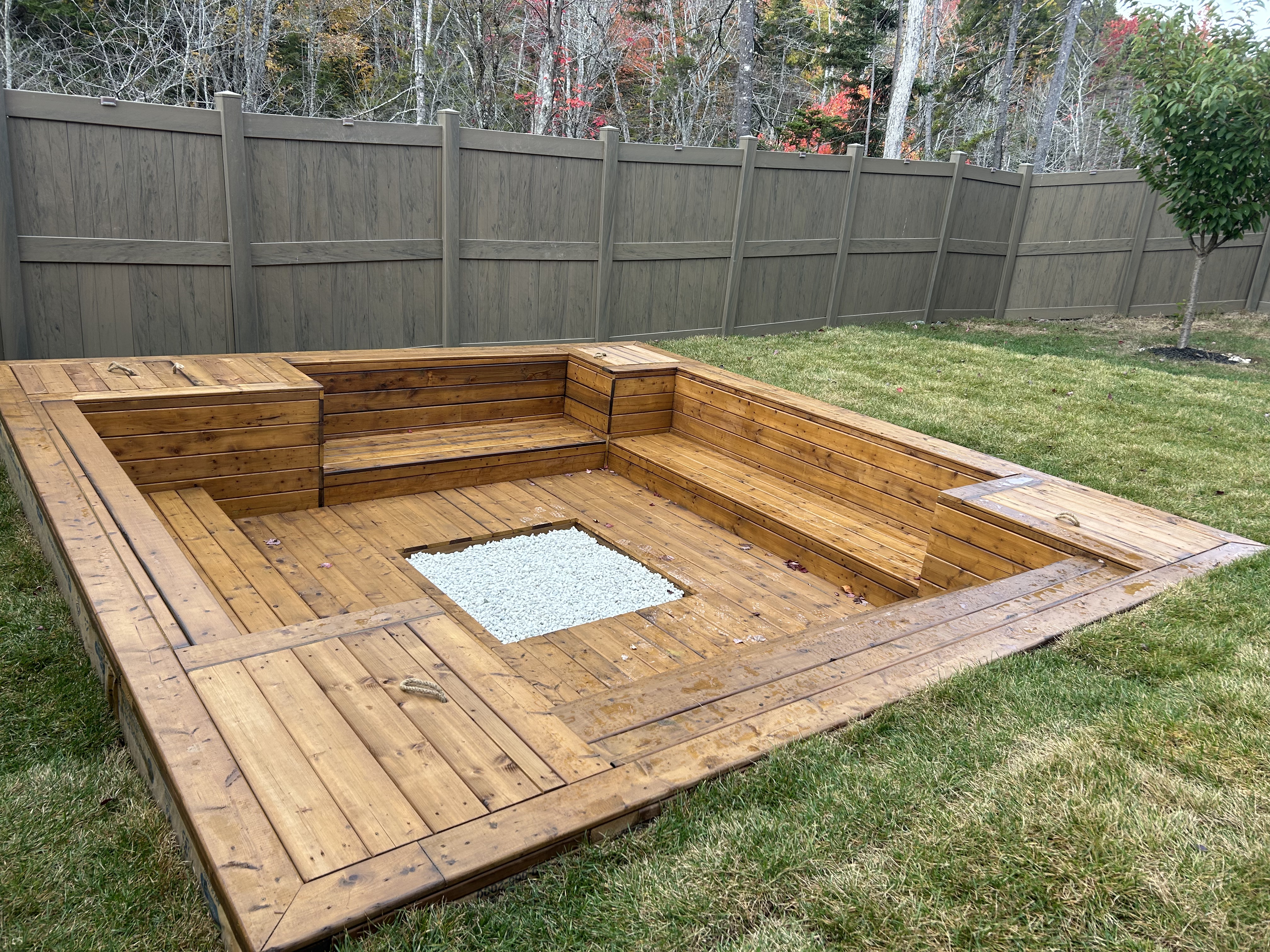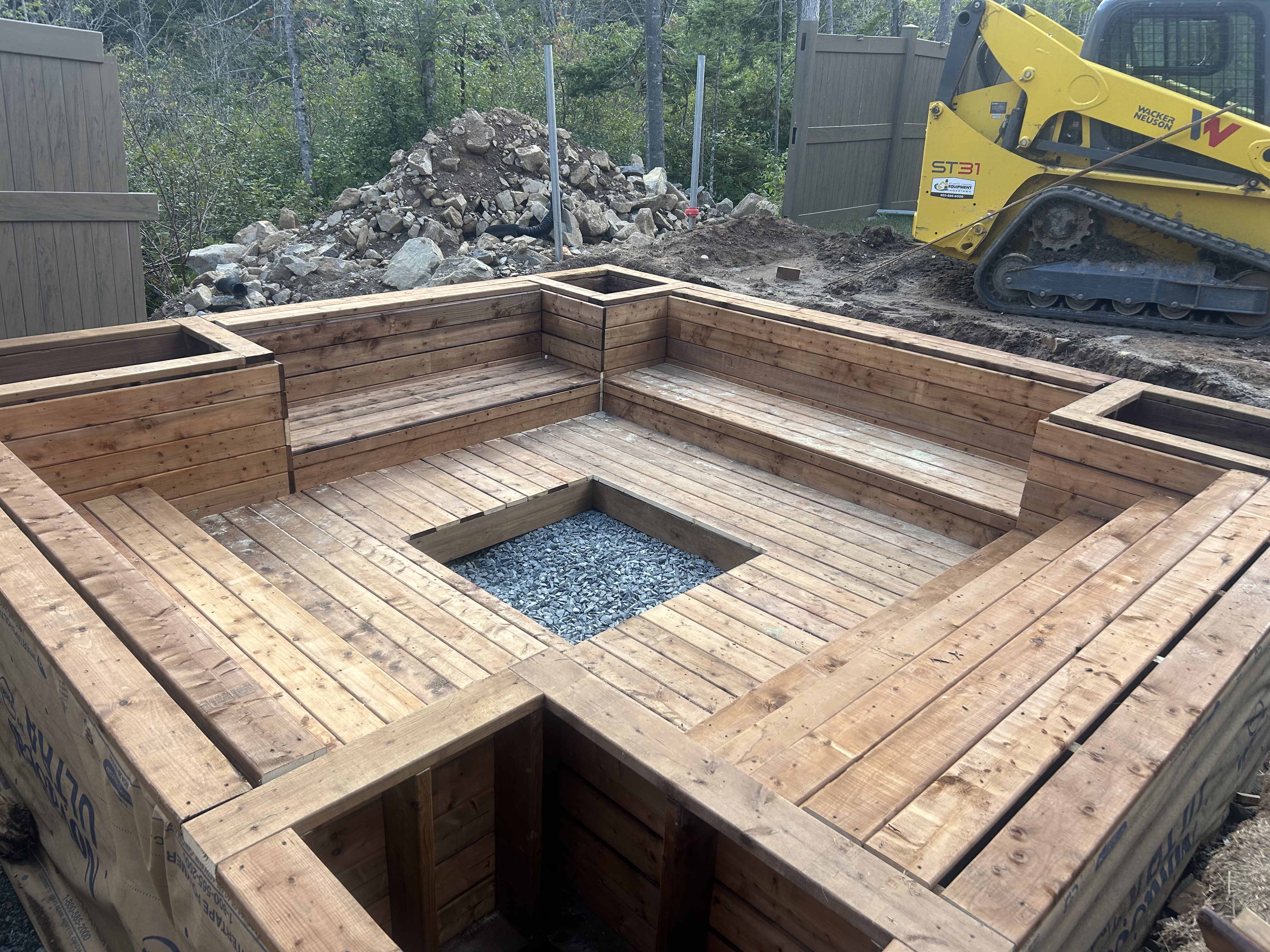 Excavated a 16 ft x 16 ft fire pit area to a depth of 4 feet, including full site preparation, grading, and leveling. The project also involved installation for drainage, precise excavation to accommodate a recessed fire pit, and preparation for surrounding wood seating and decking, resulting in a clean, well-structured, and functional outdoor gathering space.